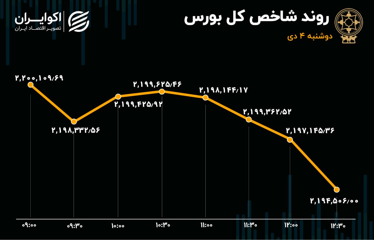 به گزارش اکوایران، در معاملات روز دوشنبه چهارم دی ماه 1402، شاخص کل بورس تهران 5 هزار و 604 واحد نسبت به روز کاری گذشته پایینتر ایستاد و به سطح 2 میلیون و 194 هزار و 505 واحد رسید.