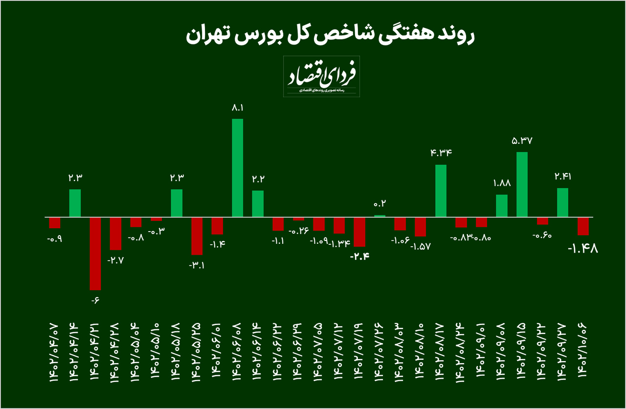 فردای اقتصاد: شاخص کل بورس اوراق بهادار تهران در معاملات هفتهای که سپری شد با افت حدود ۱.۵ درصدی همراه شد و تا سطح ۲ میلیون و ۱۷۷ هزار واحد کاهش ارتفاع داد. به رغم نزول نماگر اصلی بازار سهام، معیار هم وزن بورس نیز نزدیک به یک درصد افت را در نخستین هفته معاملاتی دی ماه به ثبت برساند. ارزش معاملات خرد (سهام و حق تقدم) در مقیاس میانگین هفته نیز از رقم ۵ هزار و ۳۸۰ میلیارد تومانی حکایت داشت. سرمایهگذاران بورسی در این هفته معاملاتی عمدتا میل به شناسایی سود داشتند به نحوی که در این بازه زمانی یک هزار و ۲۰۰ میلیارد تومان جریان نقد معاملهگران حقیقی از گردونه معاملات خارج شد.