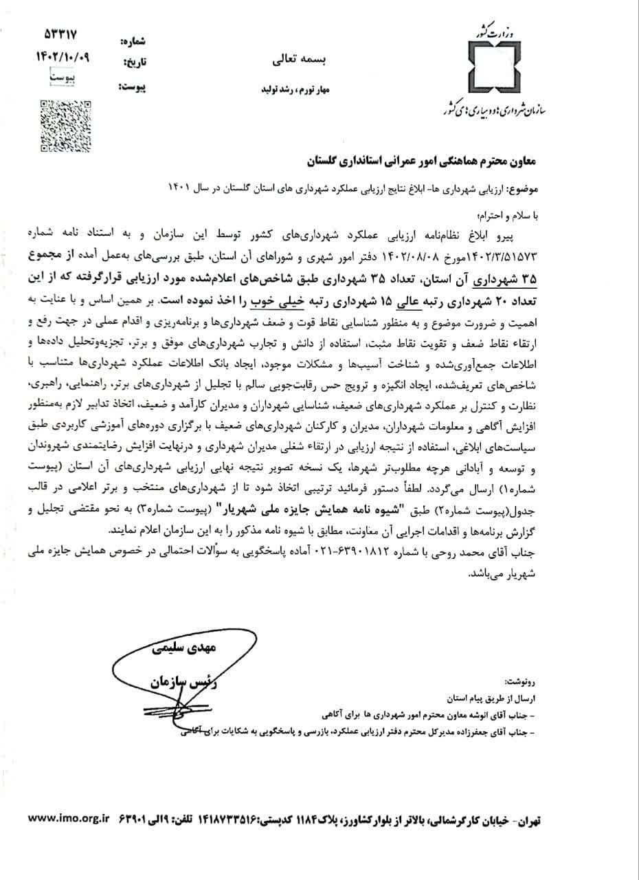 در متن این نامه به امضای مهدی سلیمی رییس سازمان شهرداریها و دهیاریها رسیده است آمده است: با عنایت به اهمیت و ضرورت موضوع به منظور شناسایی نقاط قوت و ضعف شهرداریها و برنامهریزی و اقدام عملی در جهت رفع و ارتقاء نقاط ضعف و تقویت نقاط مثبت استفاده از دانش و تجارب شهرداریهای موفق و برتر، تجزیه و تحلیل دادهها و اطلاعات جمع آوری شده و شناخت آسیبها و مشکلات موجود و سایر موارد، تعداد ۲۰ شهرداری از مجموع ۳۵ شهرداری استان حائز رتبه عالی و ۱۵ شهرداری نیز رتبه خیلی خوب را به دست آوردند.