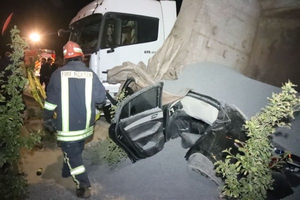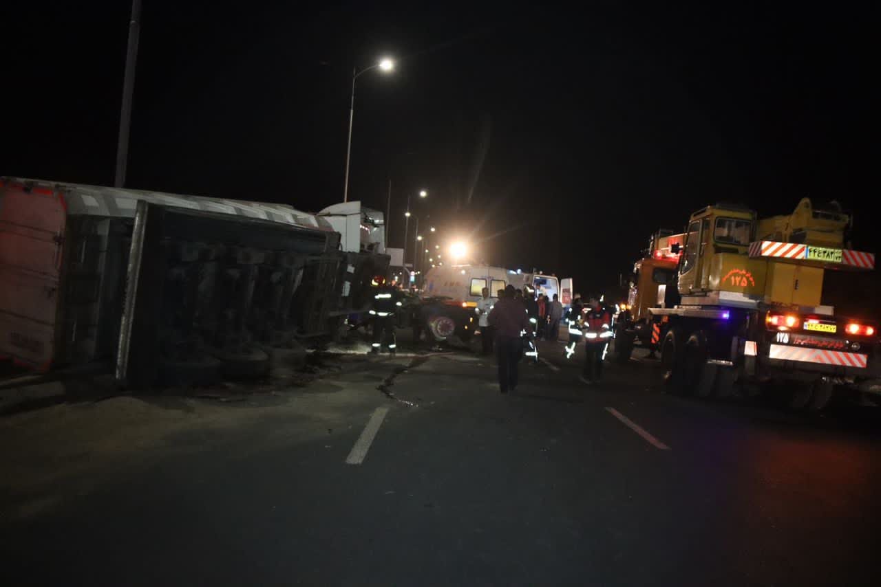 در این تصادف، یک دستگاه تریلر حامل سنگ آهن، واژگون شده و محموله آن روی اتومبیل سواری آریزو ریخت و موجب محبوس شدن 5 سرنشین این خودرو شد.