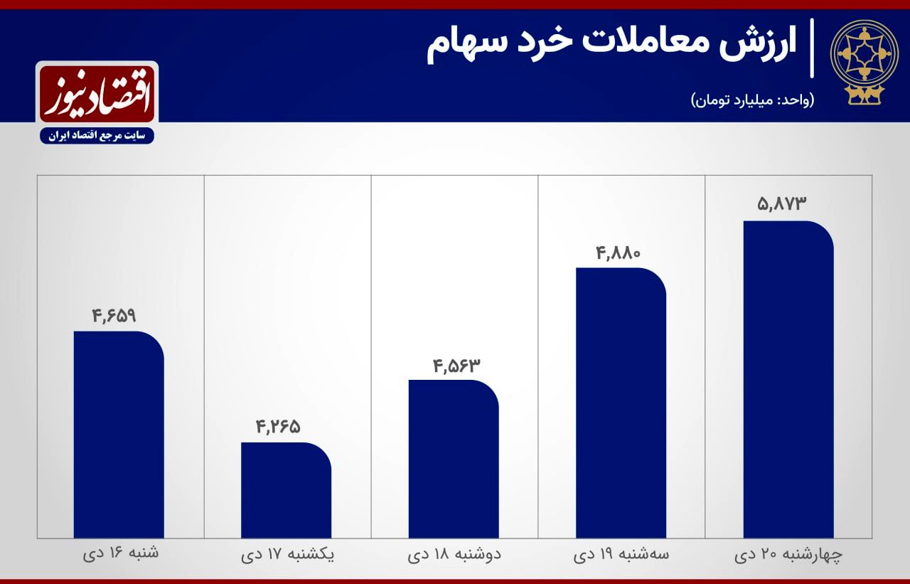 روز چهارشنبه ارزش معاملات خرد 20 درصد رشد کرد و به 5 هزار و 873میلیارد تومان رسید.