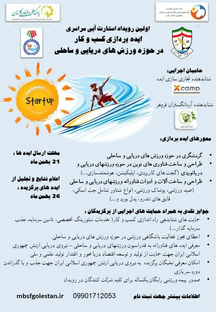 اولین رویداد استارتاپی سراسری ایدهپردازی کسبوکار در حوزه ورزشهای دریایی و ساحلی / پارک علم و فناوری گلستان با همکاری هیات ورزشهای دریایی و ساحلی استان برگزار میکنند.