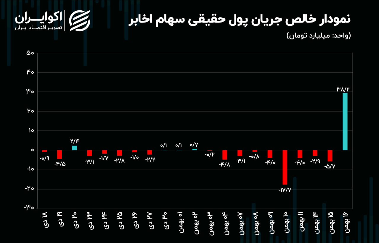 بازار سهام روز دوشنبه 16 بهمن ماه شاهد خروج سرمایه حقیقی از موقعیتهای سهامی و تداوم کاهش ارزش معاملات خرد سهامی بود. روند خروج جریان پول حقیقی روز دوشنبه به نسبت روز یکشنبه تضعیف شد و تنها 2 میلیارد تومان از مالکیت کدهای حقیقی کاسته شد. یکی از نمادهایی که در برابر روند خروجی جریان پول حقیقی در معاملات روز گذشته مقاومت کرد؛ سهام اخابر بود.