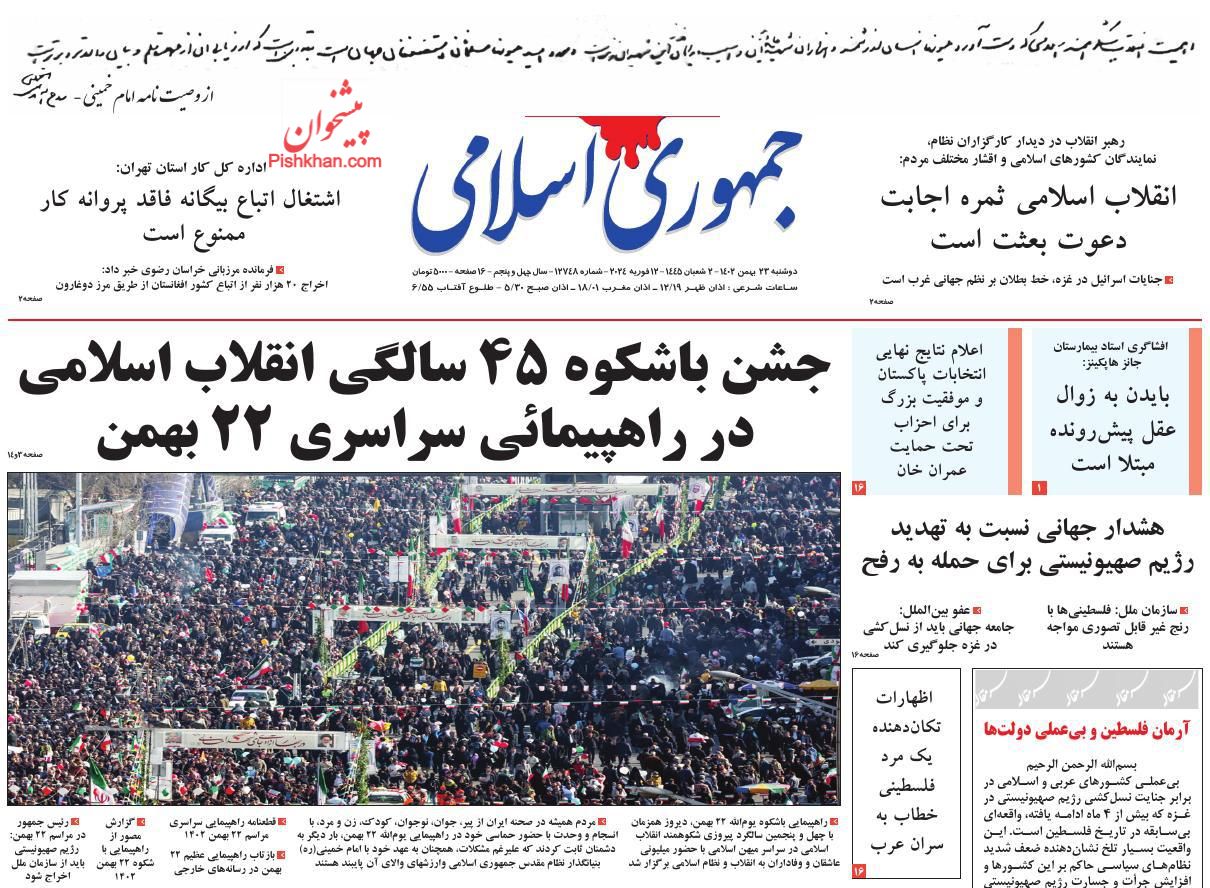 صفحه نخست روزنامه‌های امروز دوشنبه 23 بهمن 1402