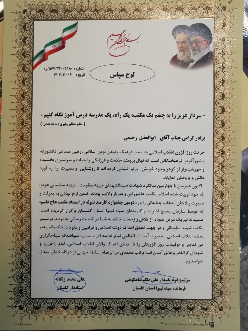 کسب رتبه کارمند بسیجی نمونه در دومین جشنواره امتداد مکتب شهید سلیمانی توسط مدیرعامل و فرمانده پایگاه بسیج امام سجاد (ع) شرکت آب و فاضلاب استان گلستان
