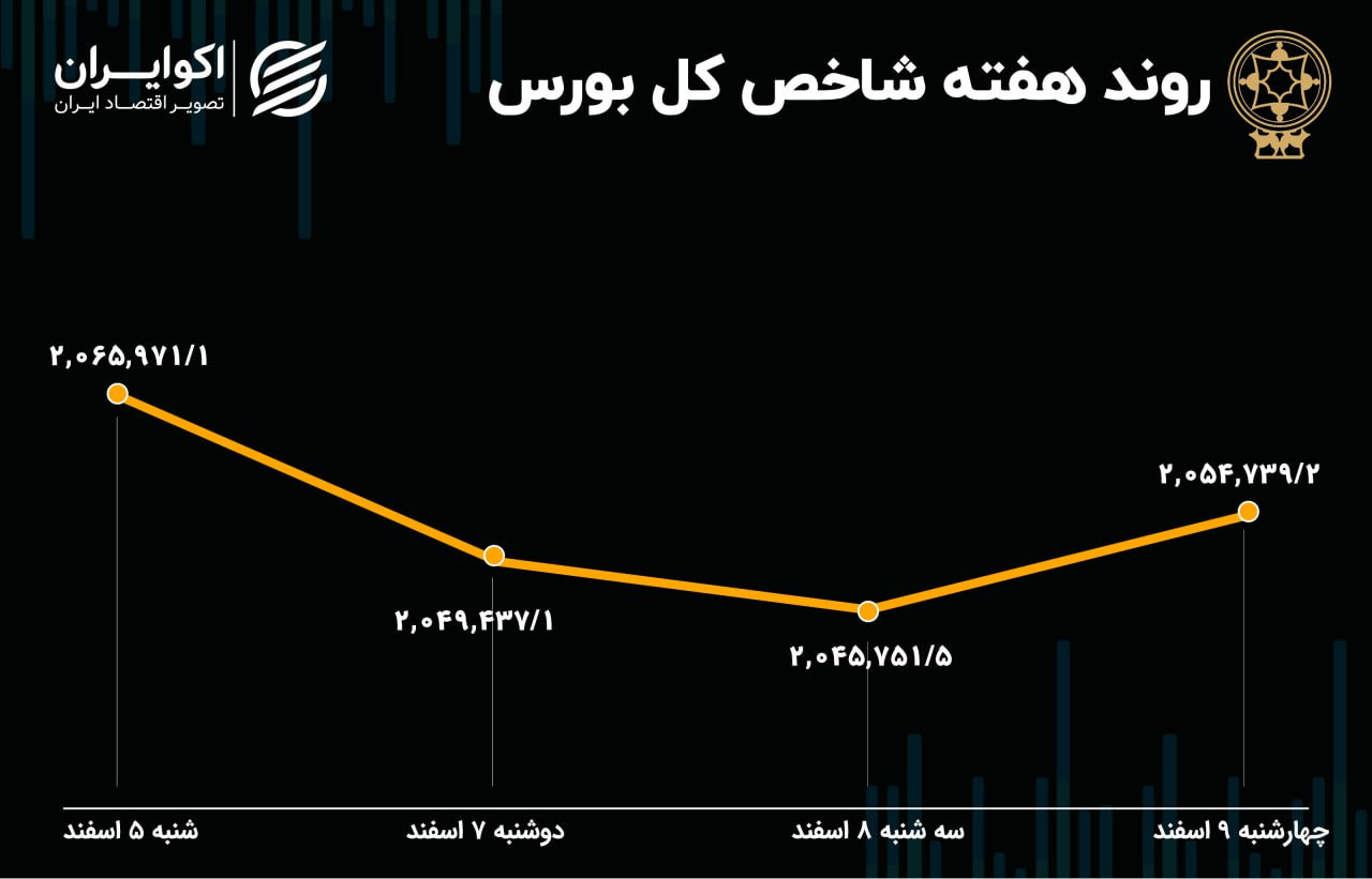 شاخص کل در آخرین روز کاری هفته به رقم 2 میلیون و 54 هزار و 739 واحد رسید و نسبت به آخرین روز معاملاتی هفته قبل 16 هزار و 105 واحد پایینتر ایستاد و بازدهی هفته شاخص بورس منفی 0.7 درصد شد.