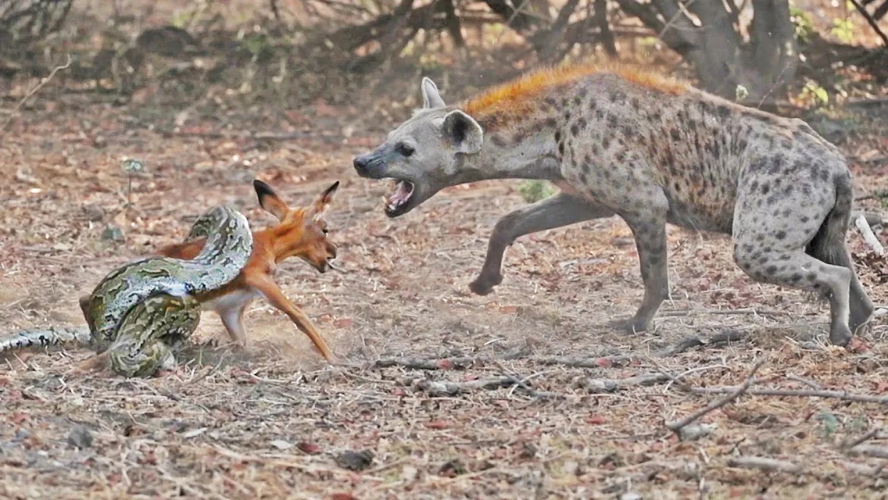(ویدئو) جدال کفتار و مار پیتون بر سر یک بچه ایمپالای نگون بخت