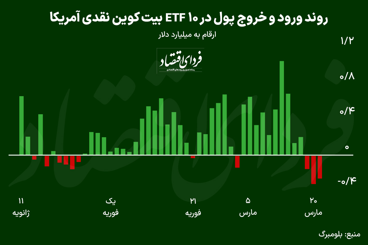 فردای اقتصاد: پادشاه رمزارزها پس از ثبت اوج تاریخی و صعود تا ارتفاع ۷۴ هزار دلاری، طی روزهای گذشته به سطوح ۶۴ هزار دلار کاهش یافته است. یکی از دلایل این افت فروکش تب صندوقهای ایتیاف بیت کوین نقدی است. مطابق نمودار بررسی ورود و خروج پول در ۱۰ صندوق بیت کوین آمریکا نشان میدهد طی روزهای گذشته خروج پول بیشتر بوده است بنابراین به نظر میرسد از هیجان بازار رمز ارزها تا حدودی کاسته شده است.