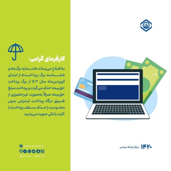 بهاطلاع میرساند «شماره برگه» و «شناسه برگ پرداخت» از ابتدای فروردينماه سال ١٤٠٣ از برگ پرداخت حقبيمه حذف میگردد و پرداخت مبلغ حقبيمه صرفاً بهصورت غیرحضوری از طریق درگاه پرداخت اينترنتی بدون محدوديت (حذف سقف پرداخت) با كارت بانکی صورت میپذیرد.