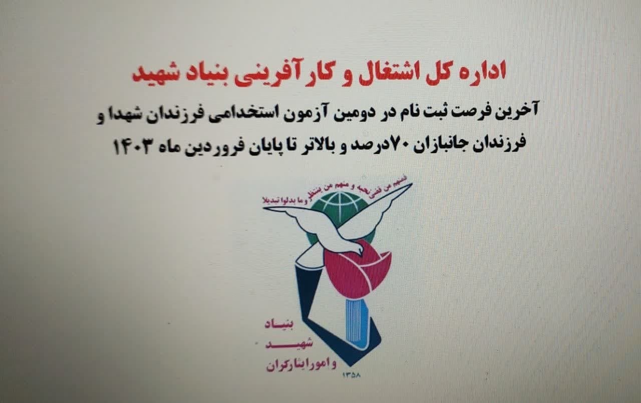 اداره کل اشتغال و کارآفرینی بنیاد شهید و امور ایثارگران اعلام کرد که ثبت نام دومین آزمون خاص فرزندان شهداء و فرزندان جانبازان هفتاد درصد و بالاتر تا پایان فروردین ماه ۱۴۰۳ تمدید شد.