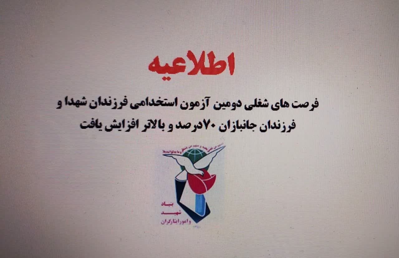 اداره کل اشتغال و کارآفرینی بنیاد شهید و امورایثارگران اعلام کرد که فرصتهای شغلی دومین آزمون خاص فرزندان شهداء و فرزندان جانبازان هفتاد درصد و بالاتر افزایش یافت.