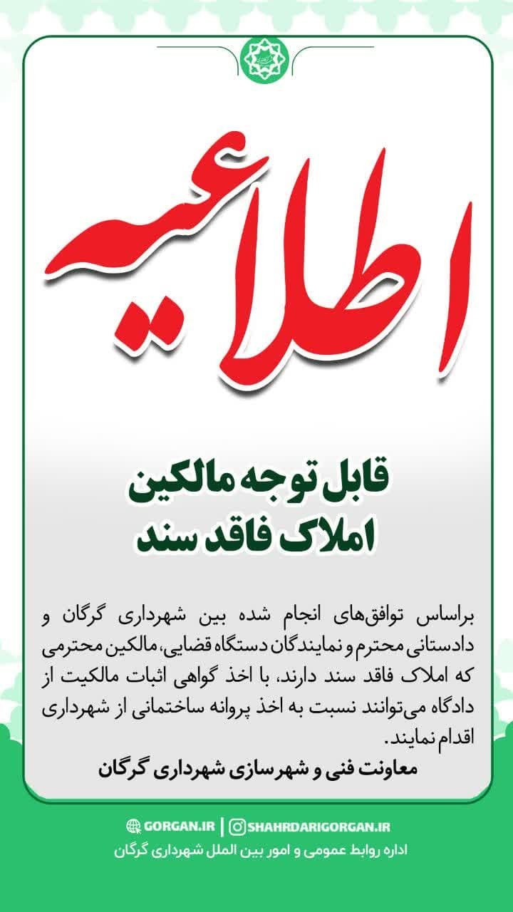 براساس توافق‌های انجام شده بین شهرداری گرگان و دادستانی محترم و نمایندگان دستگاه قضایی، مالکین محترمی که املاک فاقد سند دارند، با اخذ گواهی اثبات مالکیت از دادگاه می‌توانند نسبت به اخذ پروانه ساختمانی از شهرداری اقدام نمایند.
