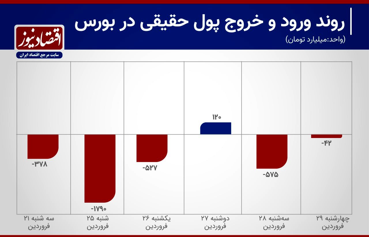 روز یکشنبه بار دیگر پول حقیقی خارج شد که رقم خروج 527 میلیارد تومان بود. اما روز دوشنبه خروج پول متوقف شد و 120 میلیارد تومان پول حقیقی وارد شد. روز سهشنبه نیز 575 میلیارد تومان خارج شد.