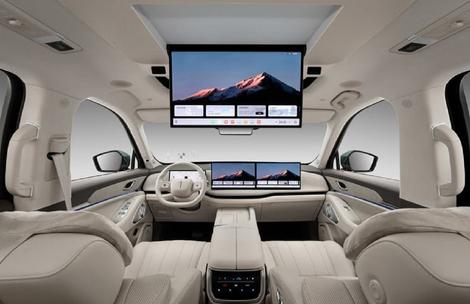 روی سقف و برای سرنشین های ردیف دوم و سوم یک نمایشگر تاشو بسیار بزرگ یا بهتر بگوئیم تلویزیون در نظر گرفته شده تا این کابین فضائی متفاوت با دیگر محصولات کلاس خود داشته باشد.