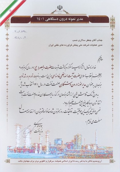 مدیر عامل شرکت ملی پخش فرآوردههای نفتی ایران به عنوان مدیر نمونه معرفی شد