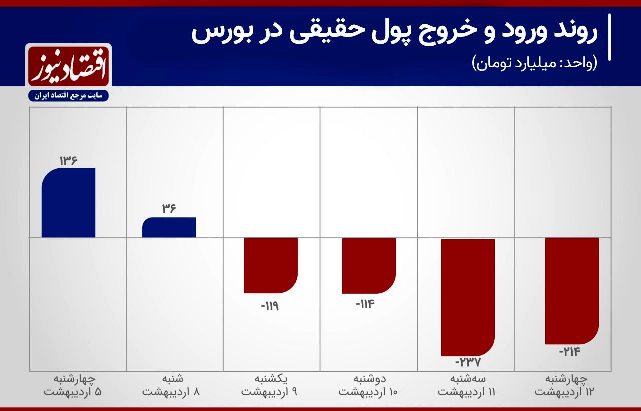 اما از روز یکشنبه بار دیگر پول حقیقی خارج شد که رقم خروج 119 میلیارد تومان بود. روز دوشنبه نیز 114 میلیارد تومان پول حقیقی خارج شد. روز سهشنبه 237 میلیارد تومان خارج شد.