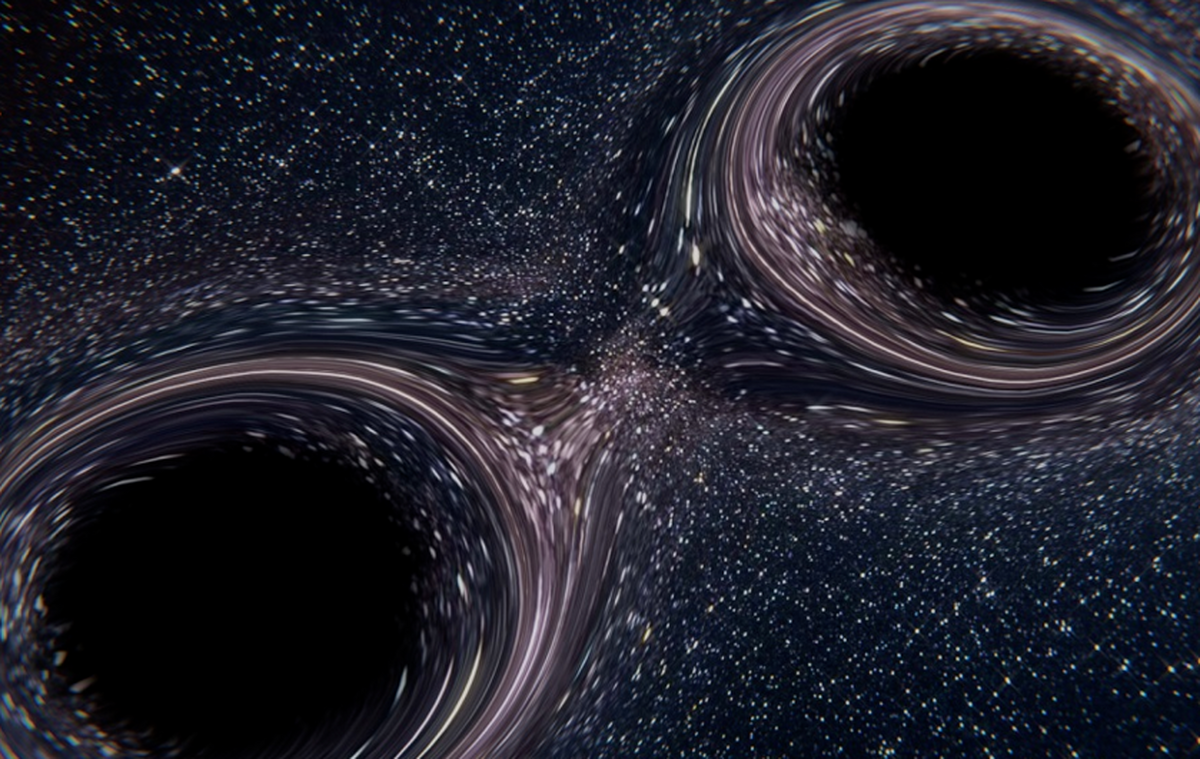 این دو سیاهچاله در مقابل پسزمینهای از ستارگان و تودههای گاز و غبار قرار گرفتهاند. گرانش شدید آنها با تاب دادن فضازمان، سبب میشود که پرتوهای نور اجرام دورتر به شکل حلقههای اینشتین خم بردارند. این دو سیاهچاله در گردش مارپیچوار به دور هم، نزدیک و نزدیکتر میشوند و درنهایت به هم میپیوندند.