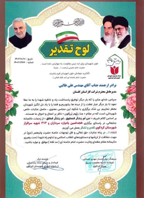 تقدیر از زحمات مدیر عامل شرکت گاز استان گلستان در راستای برگزاری هجدهمین یادواره سرداران و 313شهید سرافراز شهرستان کردکوی توسط جناب آقای احسان سیستانی دبیر ستاد یادواره شهدای شهرستان کردکوی