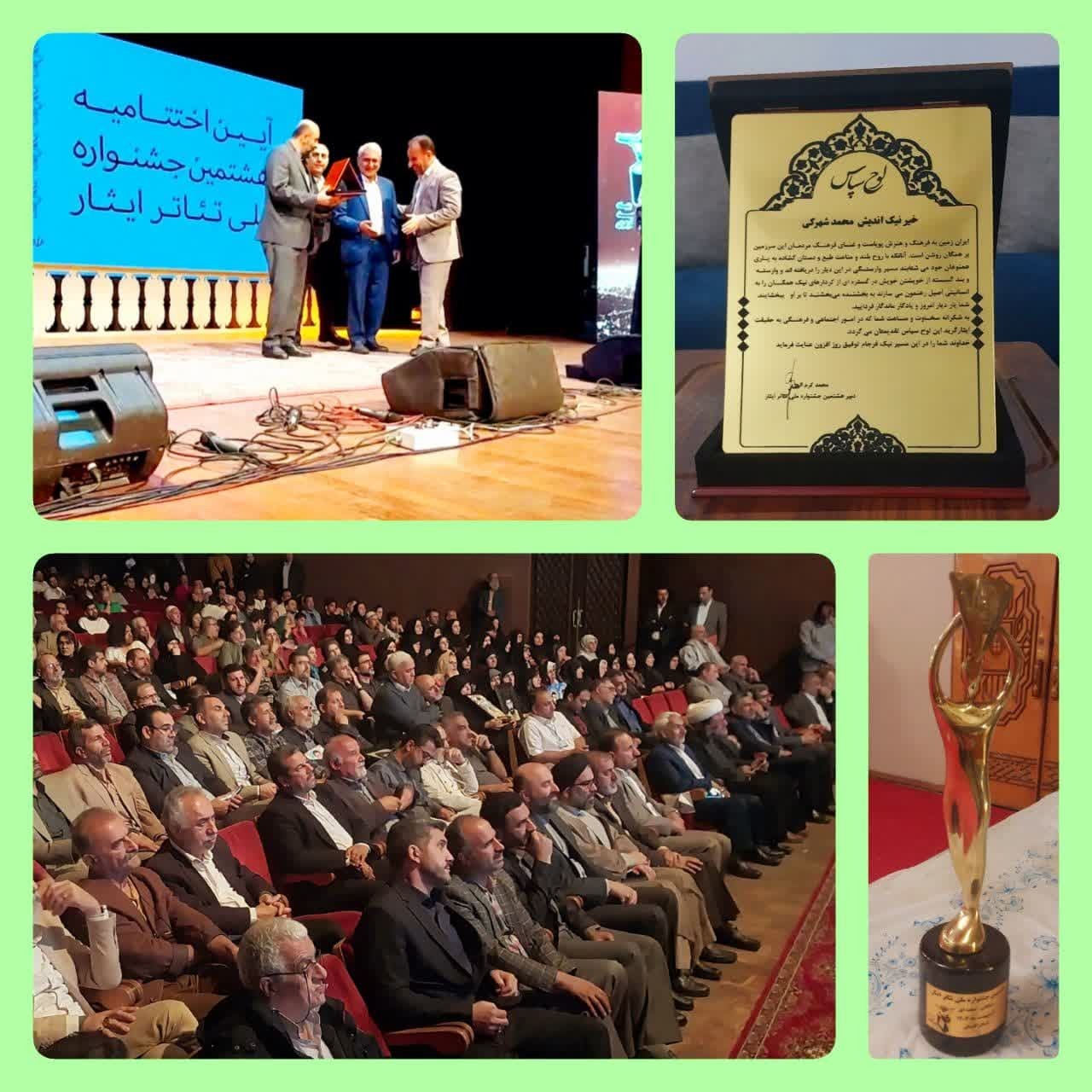 در آئین اختتامیه هشتمین جشنواره مـلـی تـئاتــر ایــثــار و در حضــور مسـئـولان کشــوری و اسـتانی، هنـرمنـدان و اصحـاب رســـانه در تالار فخـرالـدین اسعـد گـرگـانی، «حــــاج محـمــد شهــرکـی» بــه عنـوان خیـر و ایثارگر نمـونـه فرهـنـگی و اجتمـاعی (ملی) معـرفی و تجــلیل شـد.