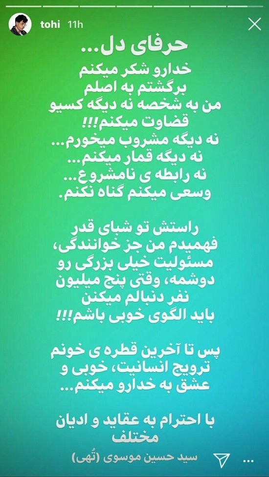 کد: 33196 | 01 خرداد 1399 ساعت 08:05 تحول حسین تهی در شب قدر استوری جالب تهى خواننده رپ که در خارج از کشور به فعالیت میپردازد. حسین تهى خواننده رپ که در خارج از کشور به فعالیت میپردازد یک استوری را منتشر کرد و از کارهای گذشتهاش ابراز پشیمانی کرد. اشتراک گذاری گزارش خطا × اشتراک گذاری مطلب: تحول حسین تهی در شب قدر فیسبوک اینستاگرام تلگرام ایکس (توییتر) ایتا بله روبیکا × گزارش خطا برای گزارش خطا با پست الکترونیکی: ruydadiran[at]gmail.com در ارتباط باشید