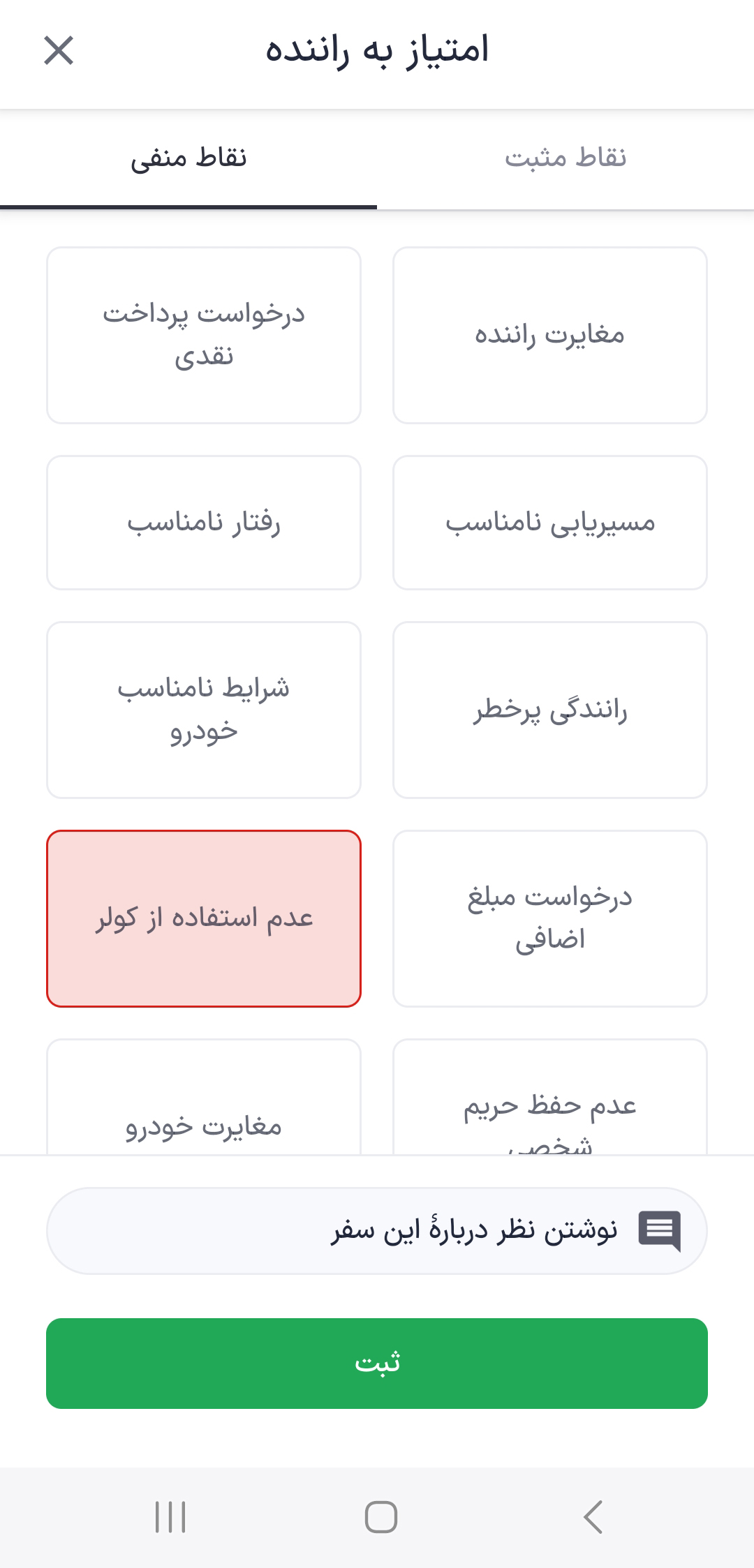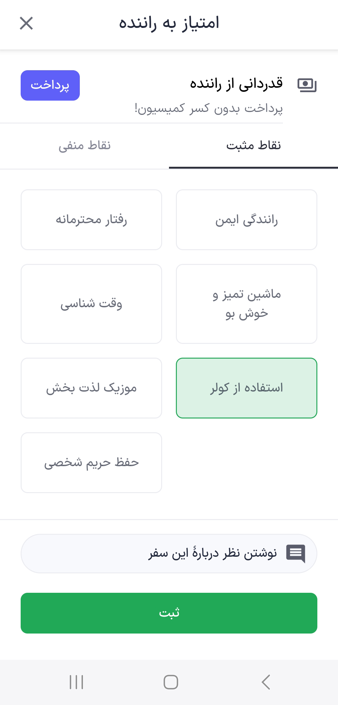 کاربران مسافر پس از پایان هر سفر میتوانند به سفر خود امتیاز دهند و دلایل این امتیاز را نیز انتخاب کنند. با شروع فصل گرما، دو گزینه «استفاده از کولر» و «عدم استفاده از کولر» به نظرسنجی پایان سفر اضافه شده است و مشارکت فعالانه کاربران در این نظرسنجی به اسنپ برای بهینهسازی شرایط تهویه خودرو کمک میکند. همچنین مشارکت حداکثری مسافران در نظرسنجی پایان سفر میتواند در تشویق و دلگرمی کاربران رانندهای که از کولر استفاده میکنند، نقش مهمی داشته باشند.