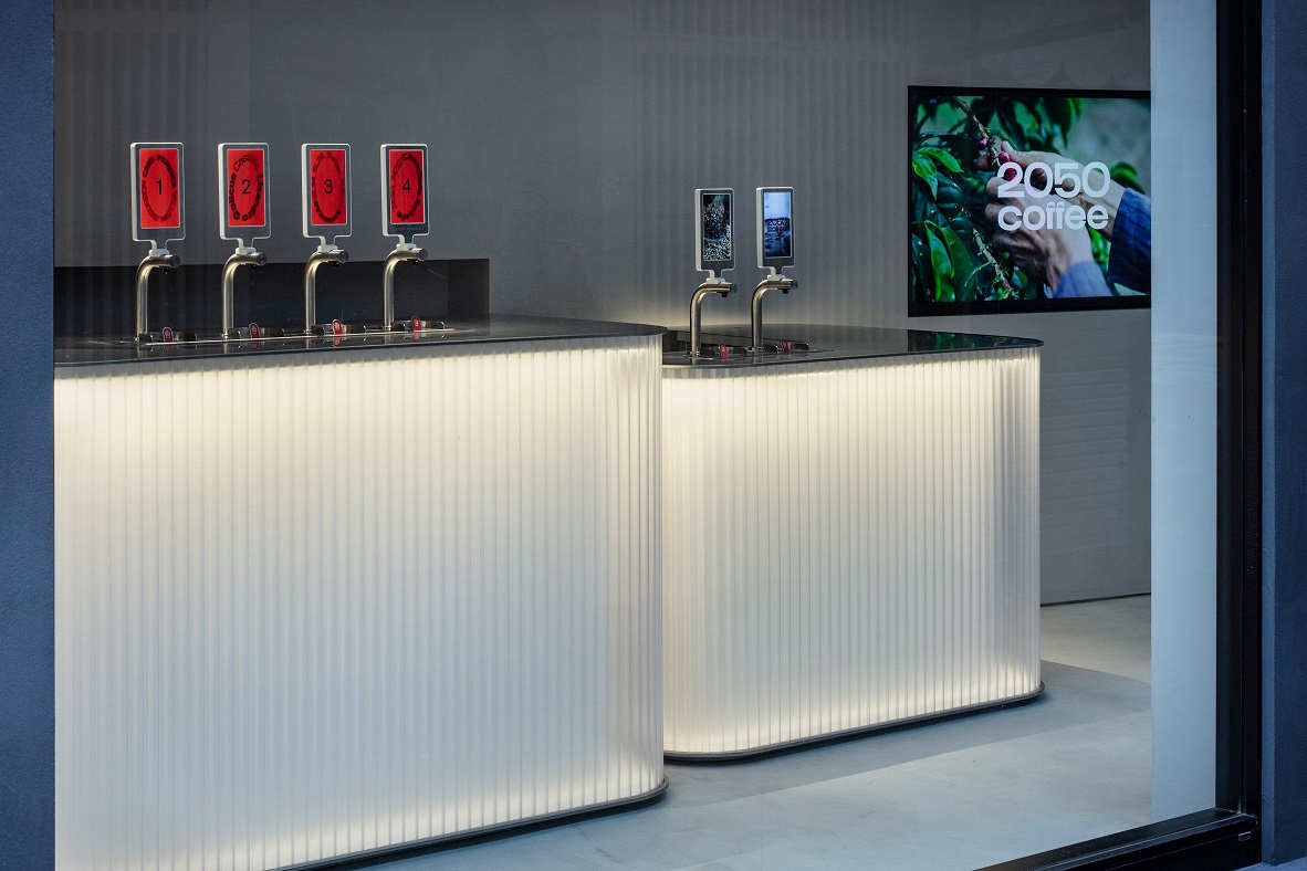 پیشخوانها دارای صفحه نمایشهای سلف سرویس با نور روشن هستند که به شیرهای نقرهای براق متصل می شوند و پنج نوع قهوه را در حدود ۱۰ ثانیه درست میکنند. از همین ورقههای پلاستیکی برای ورودی کافیشاپ نیز استفاده شده تا یک تابلو بزرگ و گرد با لوگوی ۲۰۵۰ قهوه ساخته شود که از دور هم قابل مشاهده است.