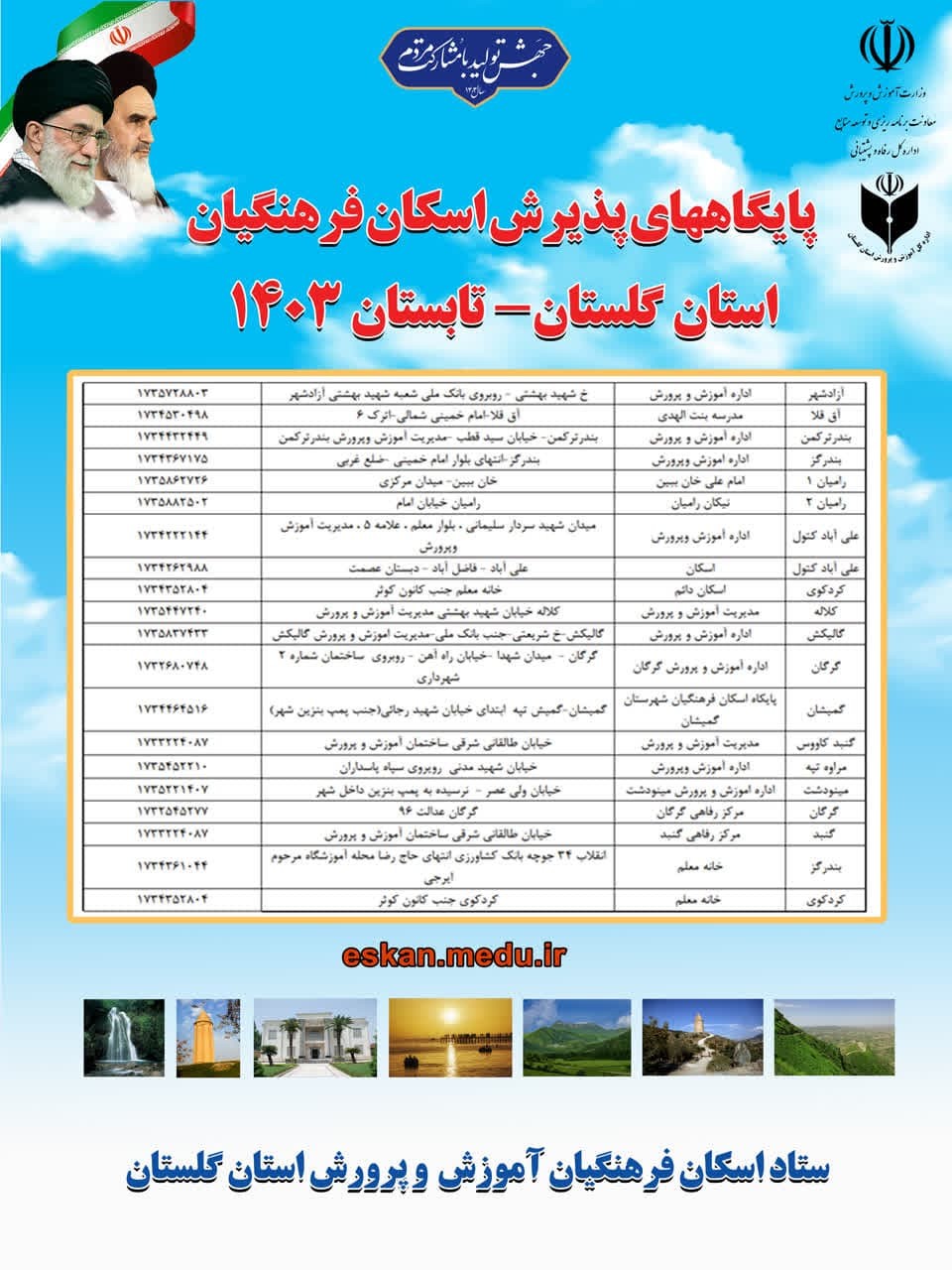 گفتنی است آموزش و پرورش استان گلستان با 17 پایگاه پذیرش و یک ستاد اسکان مرکزی در مناطق 14 گانه میزبان فرهنگیان گرامی از سراسر کشور می باشد