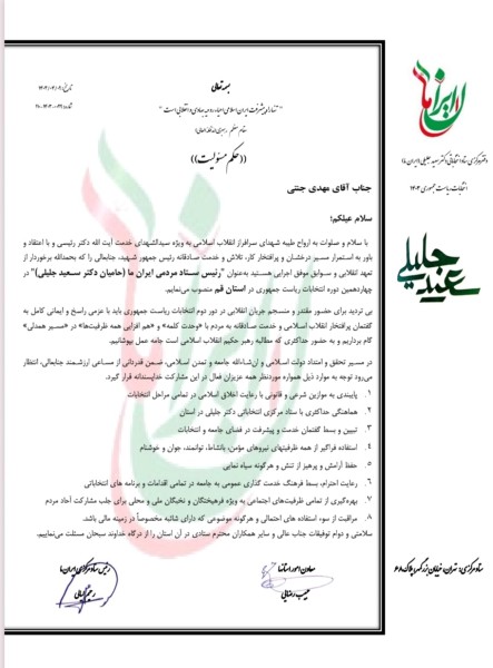 جناب آقای مهدی جنتی سلام علیکم با سلام و صلوات به ارواح طیبه شهدای سرافراز انقلاب اسلامی به ویژه سید الشهدای خدمت آیت الله رییسی و با اعتقاد و باور به استمرار مسیر درخشان و پرافتخار کار،تلاش و خدمت صادقانه رییس جمهور شهید، جنابعالی را که بحمدالله برخوردار از تعهد انقلابی و سوابق موفق اجرایی هستید به عنوان « رییس ستاد مردمی ایران ما (حامیان دکتر سعید جلیلی )در چهاردهمین دوره انتخابات ریاست جمهوری در استان قم منصوب مینمایم.