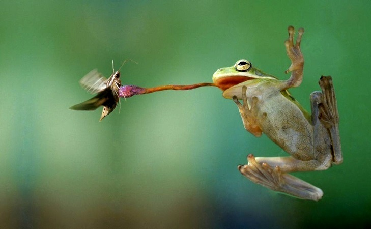 قورباغهها به خاطر زبان سریع و فرزشان معروف هستند و این ویژگی دلیل خوبی هم دارد. بیش از ۴۰۰۰ گونه قورباغه میتوانند اشیاء را با زبانشان سریعتر از پلک زدن چشم انسان بگیرند. دهان قورباغه آناتومی منحصر به فردی دارد. زبان قورباغه بر خلاف انسان، بهجای پشت گلو در جلوی فک پایین به دهانش متصل است.