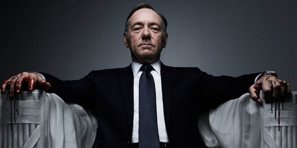 بی دلیل نیست که کوین اسپیسی روی پوستر سریال با دستهای خون آلود به تصویر کشیده شده است. با این دستها، این شخصیت روز به روز، اپیزود به اپیزود، هر مفهومی از آزادی و دموکراسی را از بین میبرد و هر چیزی را که برای دیگران عزیز است زیر میل و نیاز خود خرد میکند. لرد ولدمورت در هری پاتر و یادگاران مرگ گفت: «فقط من میتوانم برای همیشه زندگی کنم» و فرانک این سریال نیز متقاعد شده است که فقط او شایسته قدرت است.