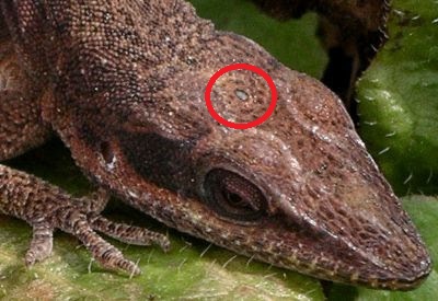 چشم سوم Anolis carolinensis که بالای سر آن دیده میشود