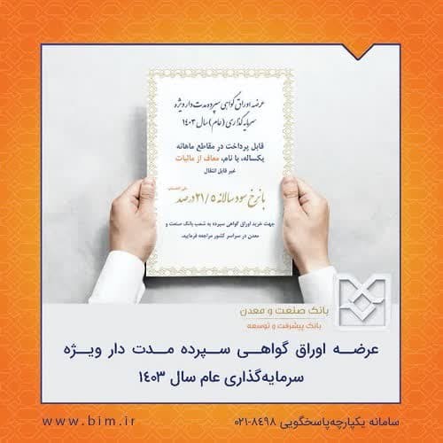 وی با بیان اینکه بانک صنعتومعدن از بدو تأسیس پیشرو در پیشرفت و توسعه بوده است، ادامه داد: این اوراق «با نرخ سود سالانه 21.5 درصد علی الحساب» قابل پرداخت در مقاطع ماهانه یک ساله، با نام، «معاف از مالیات» و غیرقابل انتقال است.