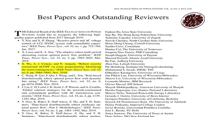 ( پخش بار بهينه مقاوم AC مقيد به ايمني ) بوده است که مطالب ارزشمند آن منجر به انتخابش به عنوان یکی از مقالات برتر این نشریه شده است .