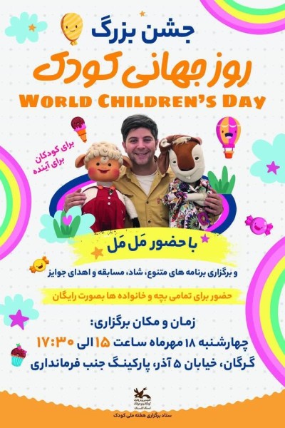 جشن بزرگ روز جهانی کودک، با حضور مل مل و ویژه برنامههای شاد و متنوع و برگزاری مسابقه و اهدای جوایز حضور برای تمامی بچهها و خانوادهها بصورت رایگان می باشد.