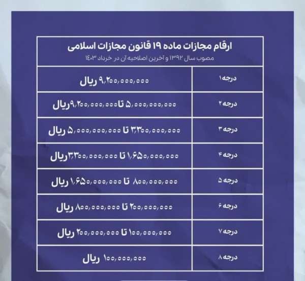▫️جزای نقدی درجه شش، ۲۰ میلیون تا ۸۰ میلیون تومان است و رقم جریمه درجه ۵، ۸۰ میلیون تومان تا ۱۶۵ میلیون تومان است.