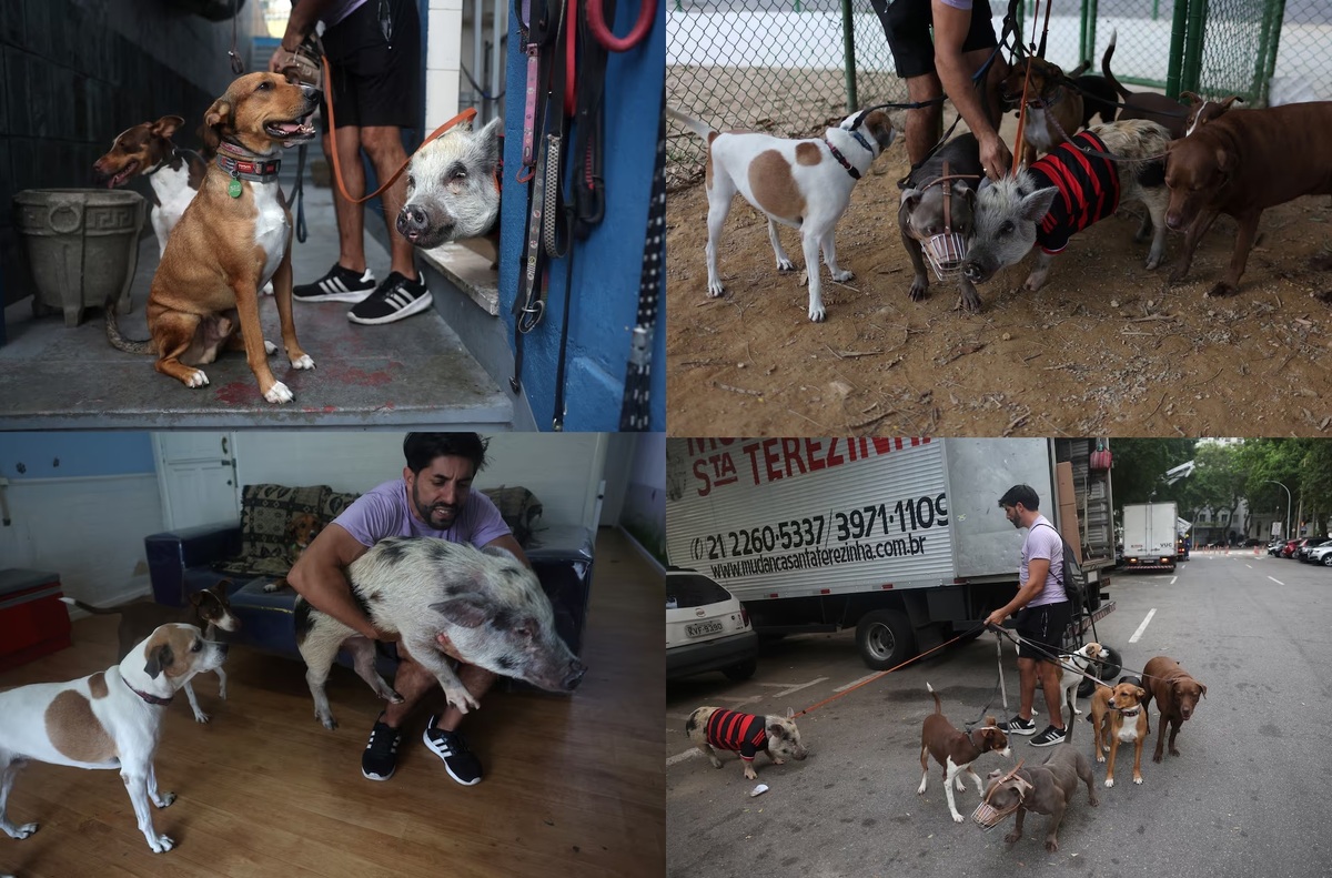 یک مربی سگ در ریو دو ژانیرو از شهرهای مهم برزیل برای آموزش سگها از خوکی به اسم «پابلو» بهعنوان دستیار خود کمک میگیرد.