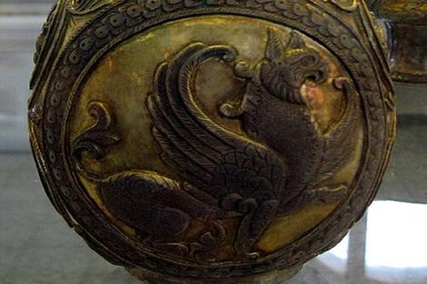 جامی از جنس نقره زراندود مربوط به دوره ساسانی. ارتفاع تقریبی ۳۰ سانتیمتر/ این جام طرح گریفین یا شیردال (دال به معنای عقاب است: فرهنگ معین) دارد که از مرغان اسطورهای دنیای باستان است.