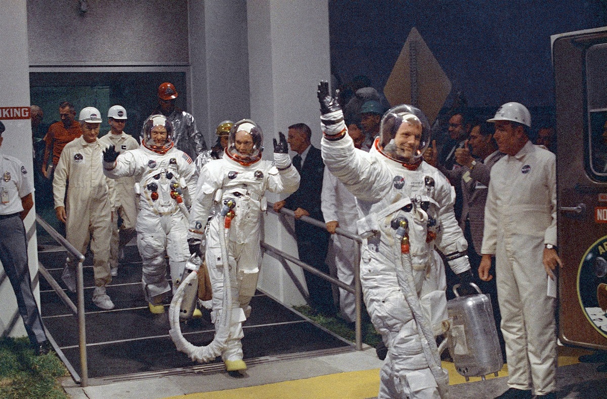 فضانوردان مأموریت آپولو ۱۱، یعنی نیل آرمسترانگ، باز آلدرین و مایکل کالینز، که در تیر ۱۳۴۸ برای اولین بار در تاریخ بشر روی ماه قدم گذاشته بودند، به دعوت دولت ایران به تهران سفر کردند. این سفر بخشی از تور جهانی آن‌ها بود که به دستور رئیس‌جمهور آمریکا، ریچارد نیکسون، برای نمایش دستاورد تاریخی آمریکا در مسابقه فضایی و تقویت روابط دیپلماتیک انجام شد.