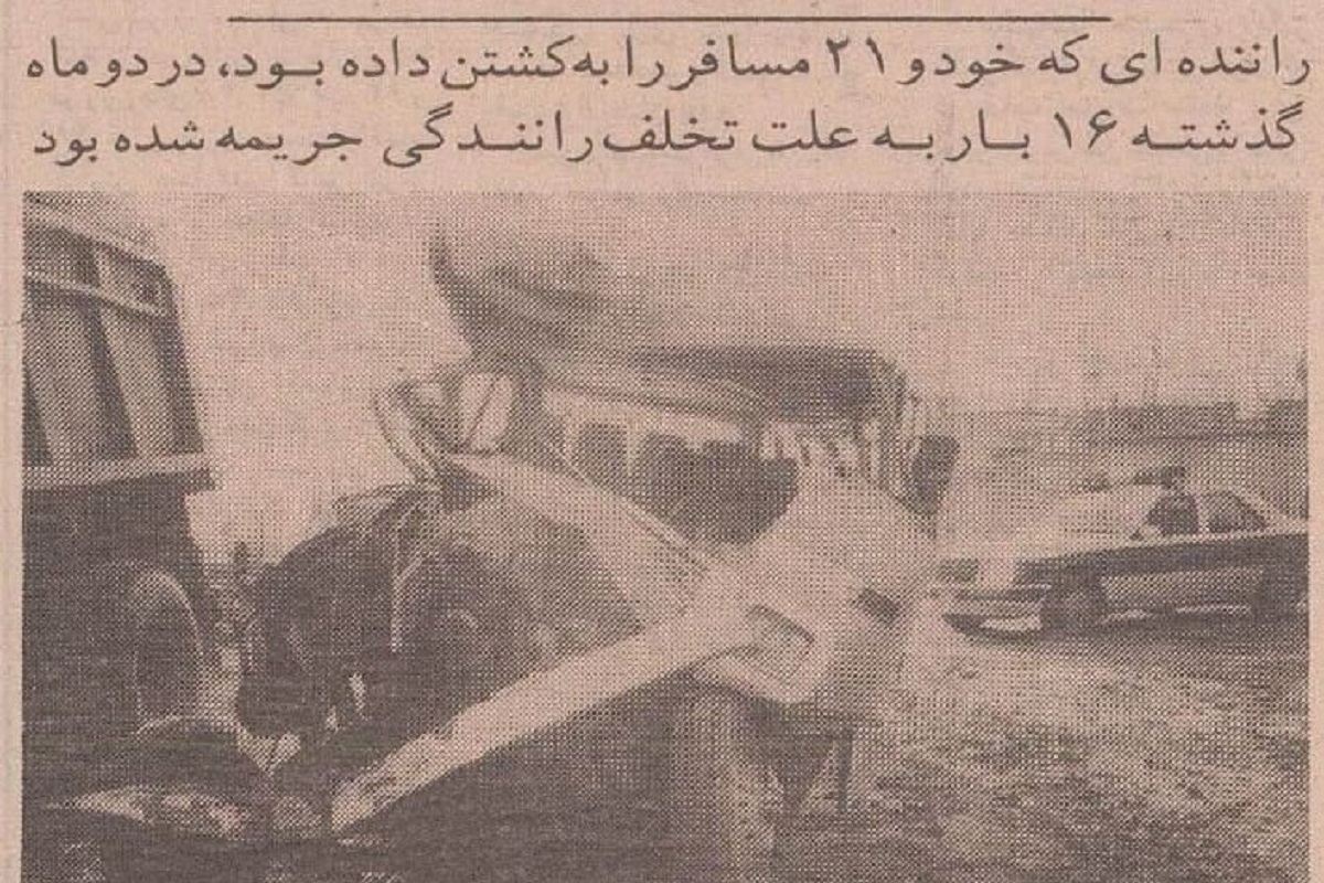در تعطیلات نوروز ۱۳۷۴ تصادف یک دستگاه مینی بوس و کامیون در محور همدان- قزوین باعث درگذشت ۲۱ تن از هموطنان شد. روزنامه اطلاعات ۱۹ فروردین ۱۳۷۴ گزارشی درباره وضعیت رانندگی راننده درگذشته مینی بوس منتشر کرد. این راننده در طول یک ماه ۱۵ بار به علت تخلف رانندگی جریمه شده بود. گزارش روزنامه اطلاعات از این راننده مرحوم را بخوانید.