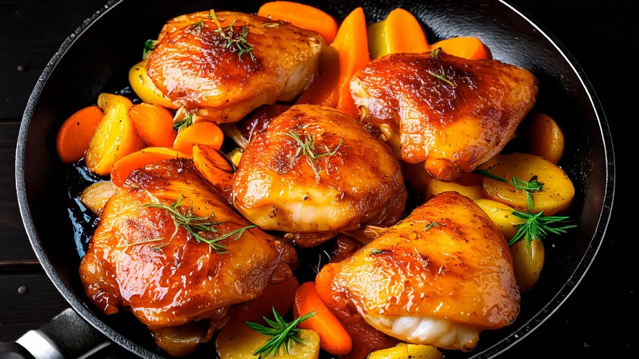 در این ویدئو یک آشپز اسپانیایی با مواد اولیه شامل: 6 عدد ران مرغ، 600 گرم سس چیلی شیرین، 20 گرم خردل، 60 میلی لیتر سس سویا، 20 میلی لیتر آب لیمو، فلفل، پاپریکا، 30 میلی لیتر روغن گیاهی، 50 گرم کره، 800 گرم سیب زمینی، یک عدد هویج، یک عدد سیب زمینی شیرین، یک عدد شلغم، یک عدد کرفس، یک عدد پیاز و 2 حبه سیر این غذا را درست می کند.