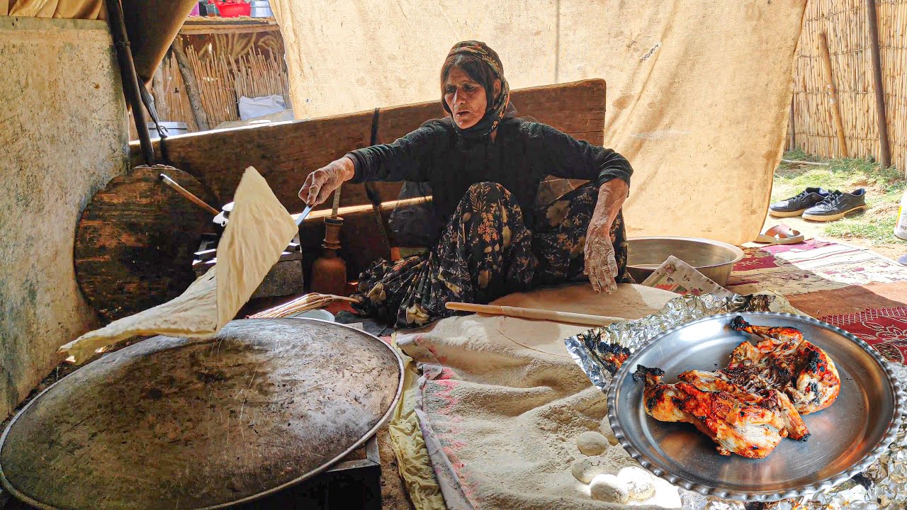 در این ویدئو یک بانوی عشایر اهل ایران را می بینید که با مهارت خ نان محلی و مرغ کبابی در تنور درست می کند.
