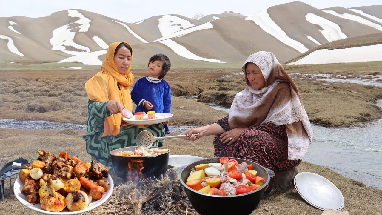 ببینید؛ غذای روستایی در افغانستان؛ پخت غذا با گوشت و سبزیجات کنار رودخانه