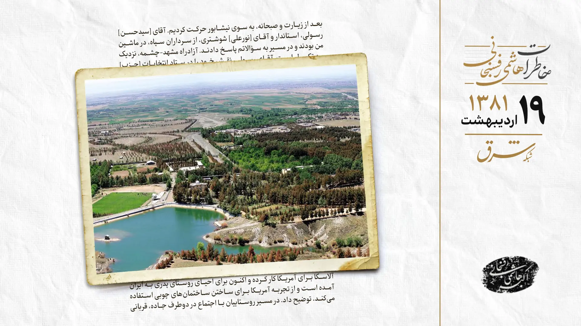 بعد از زیارت و صبحانه، به سوى نیشابور حرکت‌ کردیم. آقاى [سیدحسن] رسولى، استاندار و آقاى [نورعلی] شوشترى، از سرداران سپاه، در ماشین من بودند و در مسیر به سؤالاتم پاسخ دادند. آزادراه مشهد-چشمه، نزدیک به تکمیل است. آقای رسولى، نقش خود را در ستاد انتخابات [حزب] کارگزاران [سازندگی]، براى مجلس پنجم توضیح داد و گفت، آن اقدام کارگزاران، مهم‌ترین نقطه تحول اساسى است.