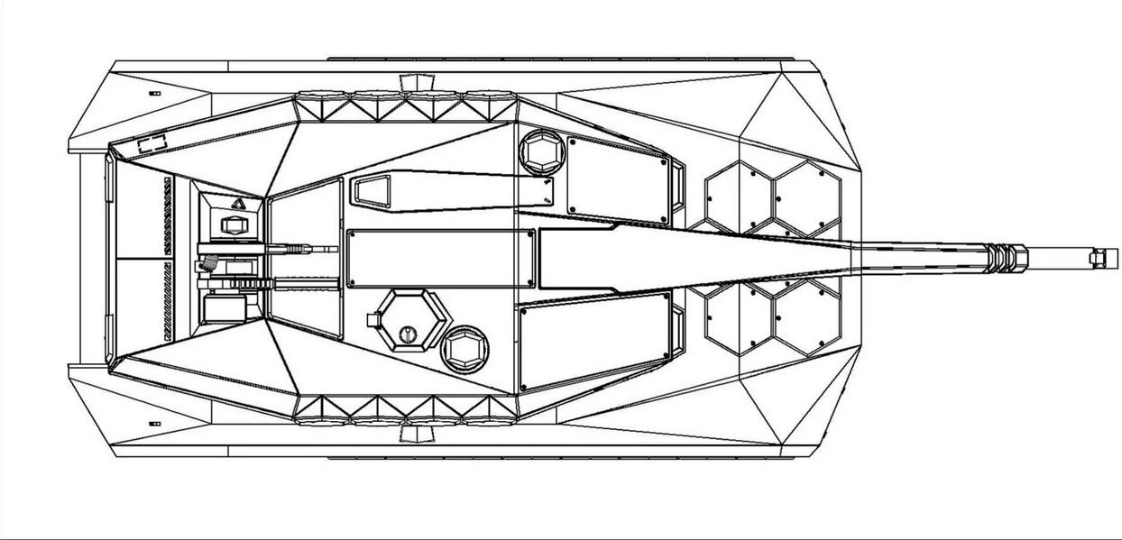 طراحی ثبتشده در بر گیرنده نُه نقشه است که تانک را از زاویههای مختلف شامل نمای ایزومتریک، تصاویر اورتوگرافیک و نمای بزرگتری از جلو و عقب نشان میدهد. مواد استفادهشده در طراحی از جنس فلز یا رزین مصنوعی هستند و شکل پنهانکاری آیندهنگری برای انجام مأموریتهای رزمی در شرایط میدانی برای آن تعیینشده. در این طراحی در مقایسه با نسخه سال قبل، برجک کمی سادهتر به نظر میرسد.