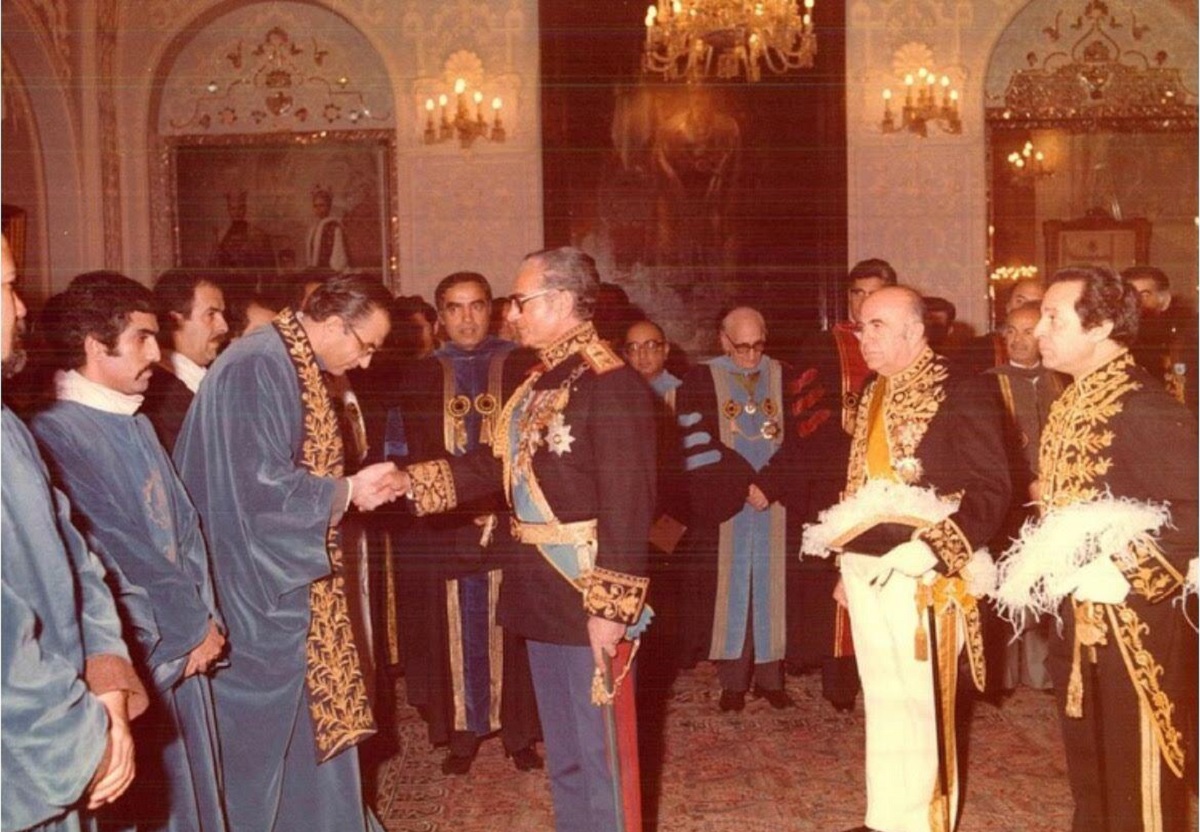 این تصاویر متعلق به دیدار شاه با اساتید دانشگاه صنعتی آریامهر (صنعتی شریف) در سال ۱۳۵۴ است. محمدرضا امین، رئیس دانشگاه نیز در تصویر دیده می شود.