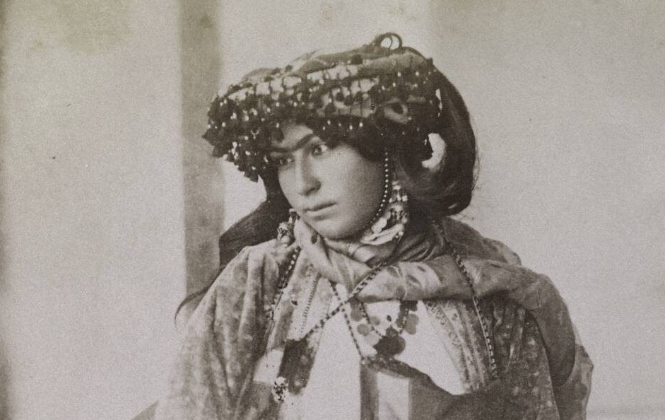 پرترهای از یک زن ایرانی عهد قاجار با سربندی که احتمالا مربوط به مناطق کُردنشین است.