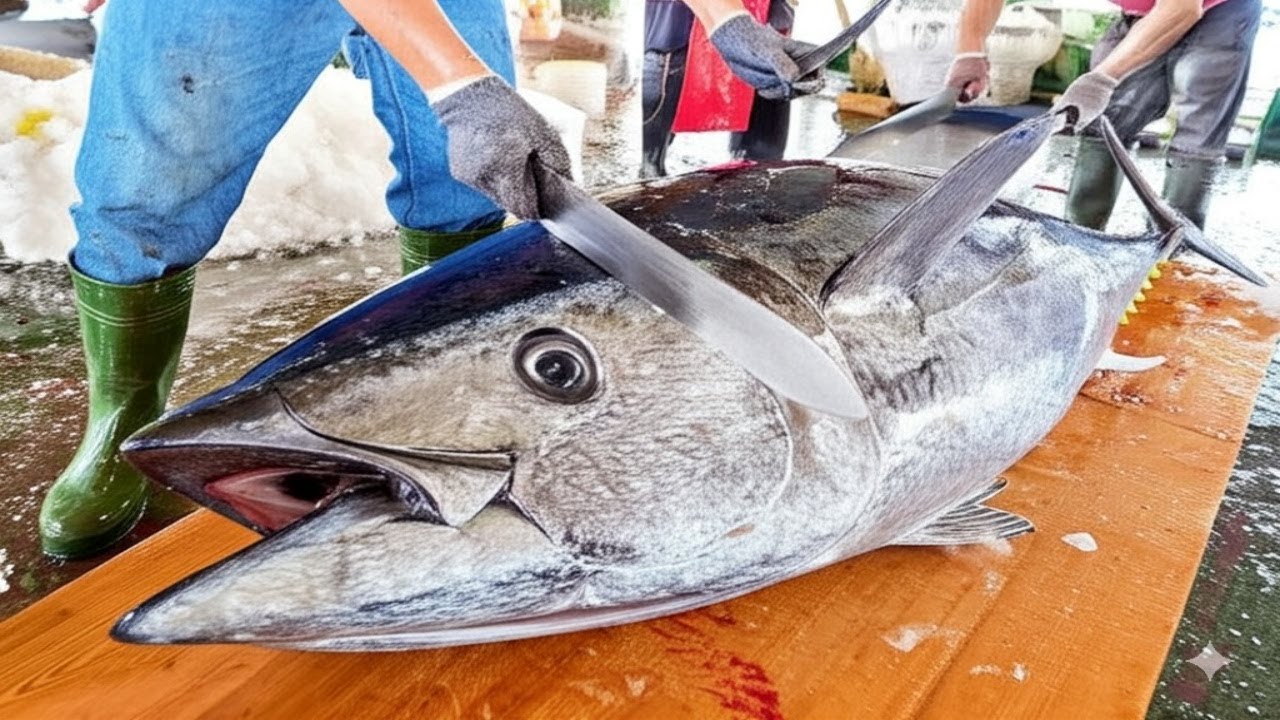 ببینید؛ غذای خیابانی در ژاپن؛ برش ماهی تن 240 کیلوگرمی و تهیه ساشیمی در اوکیناوا