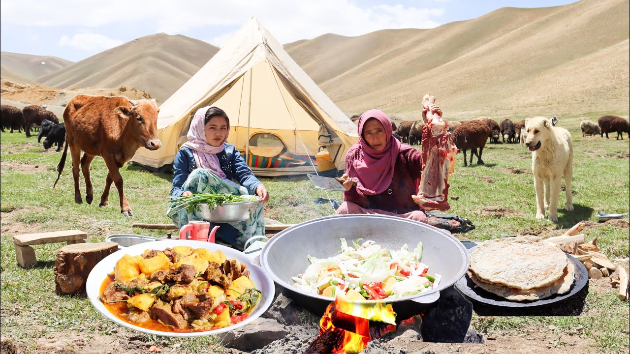 در این ویدئو یک بانوی عشایر اهل افغانستان را خواهید دید که با گوشت، سیب زمینی و .. یک آبگوشت در دامنه ی سرسبز کوه درست می کند.