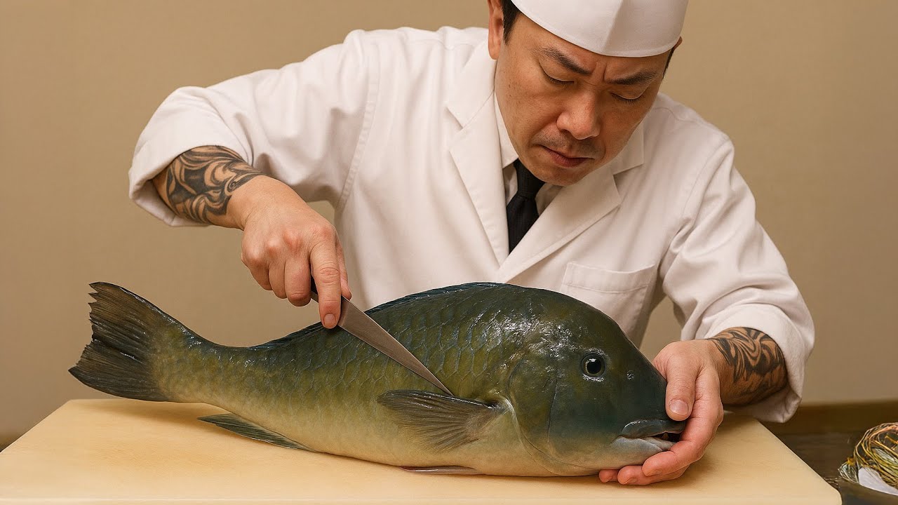در این ویدئو یک آشپز ماهر ژاپنی با برش یک ماهی کمیاب Scarbreast Tuskfish را برش داده و با آن ساشیمی درست می کند.ماهی Scarbreast Tuskfish یک نوع ماهی گرمسیری است که بیشتر در آبهای مرجانی منطقهٔ اقیانوس آرام غربی و دریای چین جنوبی یافت میشود. این ماهی دارای بدنی کشیده و رنگی است با لکهای متمایز در ناحیه سینه (که به همین دلیل نام "scarbreast" گرفته). دندانهای جلویی بزرگ و نیشمانند دارد که برای شکستن سختپوستان و صدفها به کار میبرد. در آشپزی جنوبشرق آسیا بهویژه در چین، تایلند و فیلیپین مصرف خوراکی دارد. گوشت آن سفید، لطیف و بسیار خوشطعم است.