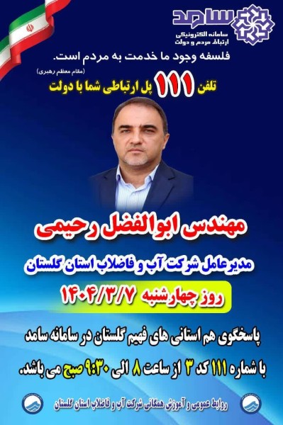 گفتنی است،هم استانی های عزیز می توانند برای مطرح نمودن سوالات مورد نظر خود پیرامون مباحث آب و فاضلاب و یا ارائه هرگونه پیشنهاد و انتقادی از ساعت ۸ الی ۹:۳۰ صبح روز چهارشنبه مورخ ۱۴۰۴/۳/۷ با شماره تماس ۱۱۱ کد ۳ با مدیر عامل شرکت آب و فاضلاب استان گلستان ارتباط برقرار نموده تا بصورت مستقیم پاسخ خود را دریافت نمایند.